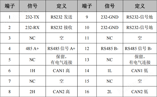 端子接口包括1個(gè)RS232、1個(gè)RS485,2個(gè)CAN總線(xiàn)接口,使用插拔式雙排彈簧按壓式端子引出。