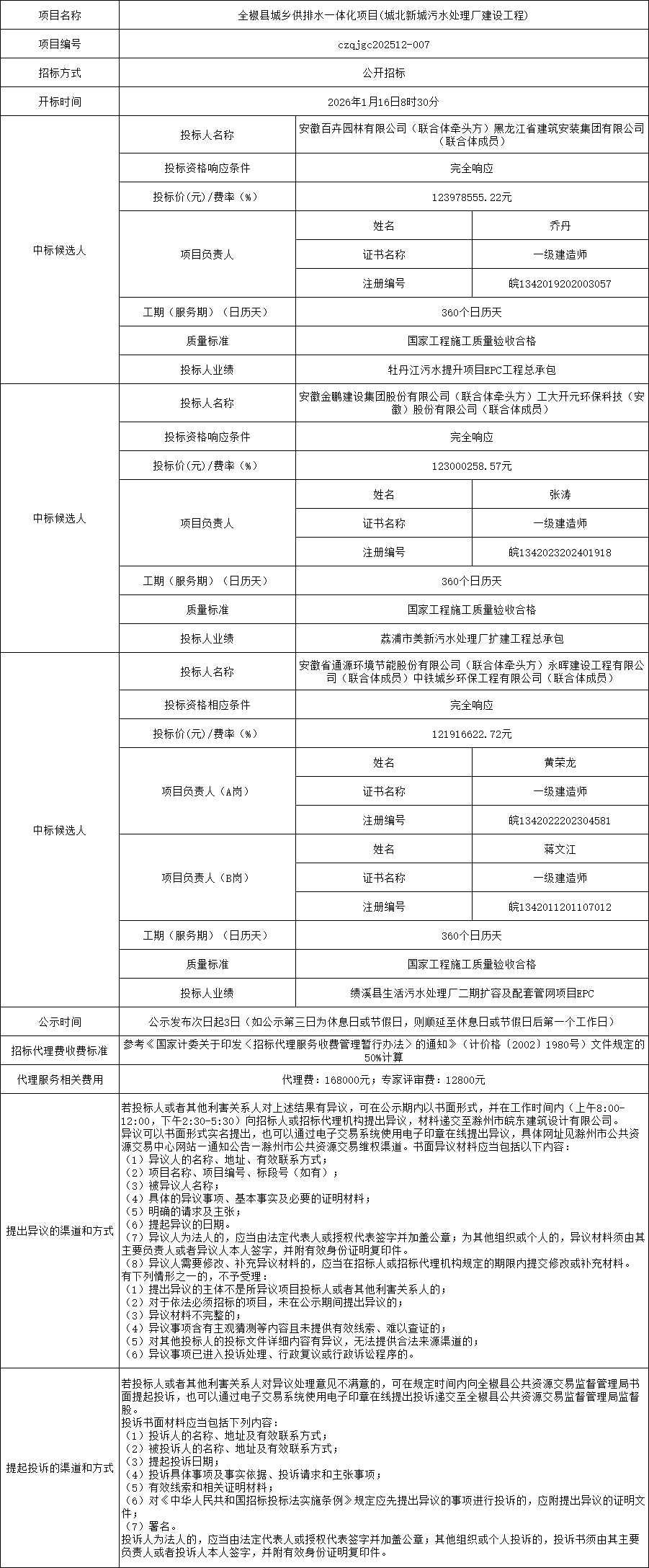 安徽省阜陽市潁東區(qū)化工園區(qū)工業(yè)污水處理廠建設EPCO項目中標結(jié)果公示。阜陽城投建設有限公司、北京市市政工程設計研究總院有限公司、阜陽生態(tài)環(huán)境科技有限公司、安徽徽裕建筑工程有限公司、中建三局集團有限公司聯(lián)合體中標,中標價:447508973.0000元。1.6億!陜西蒲城縣城鎮(zhèn)污水處理廠提升改造及配套管網(wǎng)建設項目EPC招標