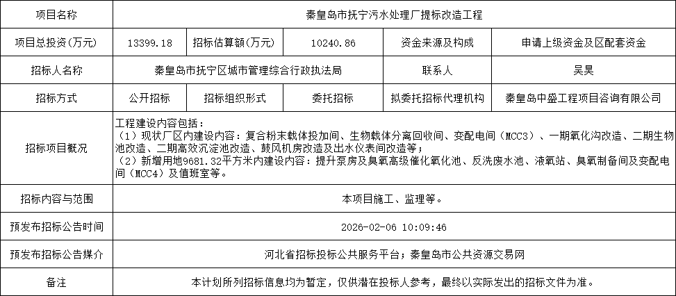2026-02-09 09:18:07來(lái)源:秦皇島市公共資源交易網(wǎng) 關(guān)鍵詞:污水處理廠污水提標(biāo)改造閱讀量:17515