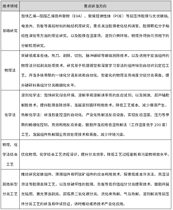 (二)突破高效分離工藝。開展光伏組件膠膜粘結(jié)機(jī)理研究,豐富完善膠膜低成本解離技術(shù)理論體系。加快研發(fā)晶硅單玻、雙玻等組件的物理法、化學(xué)法、結(jié)合工藝及新型分離工藝,攻克光伏組件部件與膠膜的綠色、高效分離技術(shù),鼓勵(lì)開發(fā)非破壞性拆解技術(shù),探索完整玻璃等材料獲取路徑。詳見附件《高效分離工藝重點(diǎn)研發(fā)方向》。(工業(yè)和信息化部、生態(tài)環(huán)境部按職責(zé)分工負(fù)責(zé))