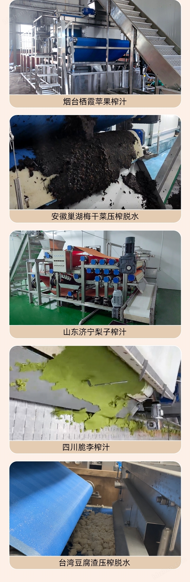 廣泛應(yīng)用于食品、飲料、釀酒、制藥等領(lǐng)域中,例如:蘋果、梨子、草莓、橘子、橙子、藍(lán)莓、桃子、梨子、獼猴桃、火龍果、桑葚、沙棘果、檸檬、柚子、葡萄、菠蘿、西梅、芒果、楊梅、海棠果、番茄、西紅柿、胡蘿卜、菠菜、紫甘藍(lán)、芹菜、生姜、白菜、蘿卜等果蔬的榨汁。藥渣、尾菜、梅干菜、榨菜、酸菜、酒糟、豆渣等物料的脫水。