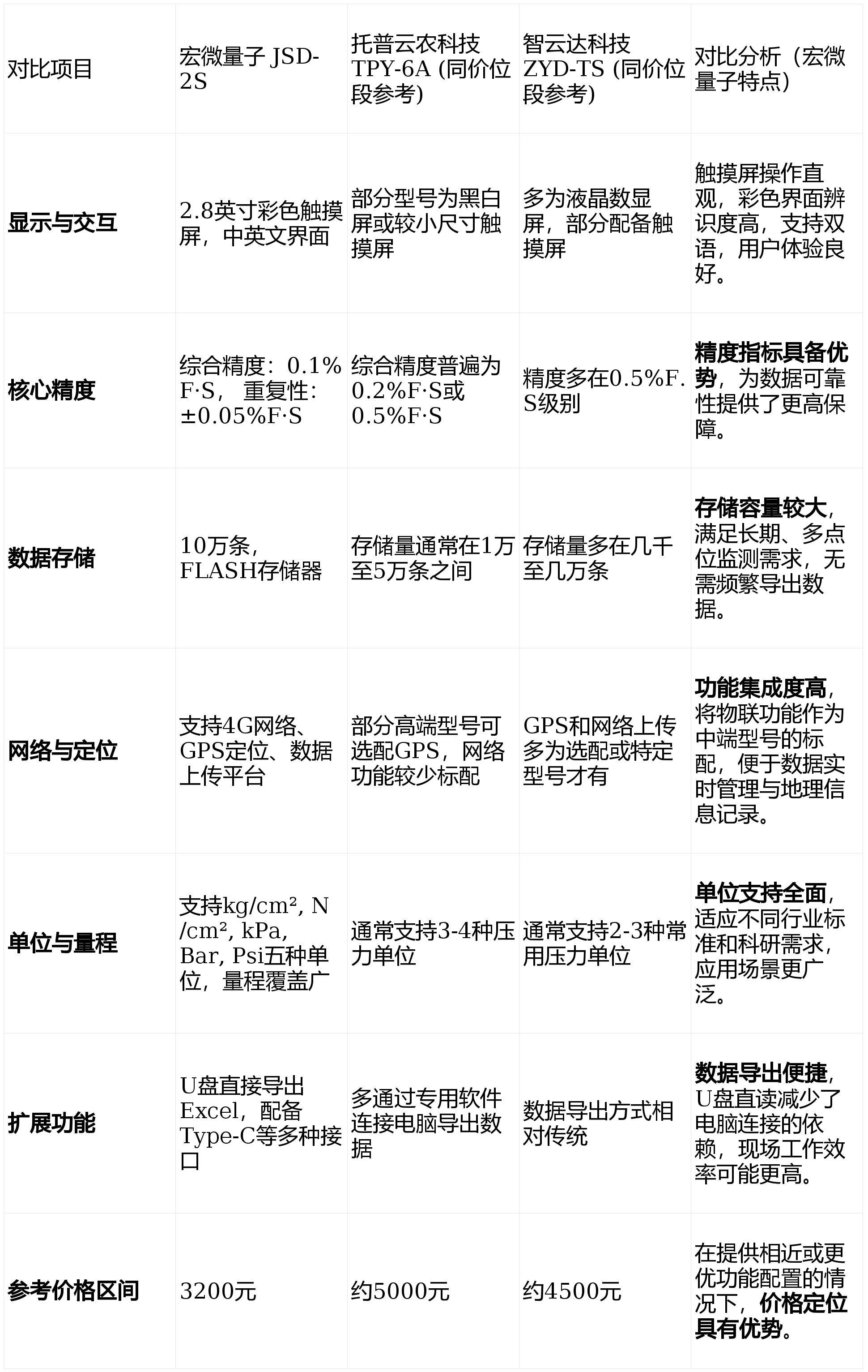 綜合以上維度分析,宏微量子土壤緊實(shí)度測定儀產(chǎn)品線展現(xiàn)出一些特點(diǎn):產(chǎn)品譜系完整,從基礎(chǔ)型到深度專業(yè)型覆蓋全面;在主流消費(fèi)價(jià)位段(特別是2000-4000元),其產(chǎn)品在測量精度、功能集成度(如物聯(lián)網(wǎng)特性)和數(shù)據(jù)顯示交互方面提供了有競爭力的組合。