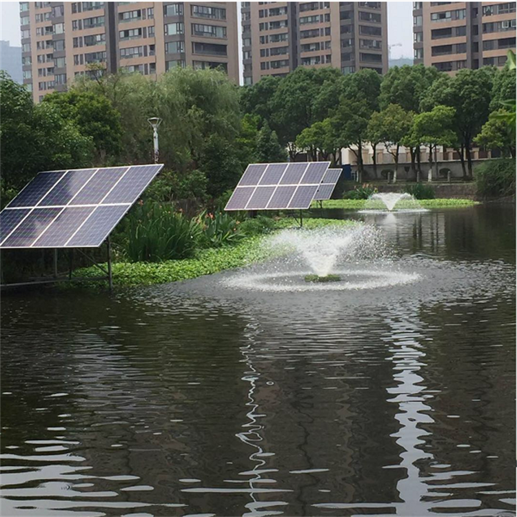 太陽能噴泉式曝氣,可浮于水面并能隨水位升降,是一種由太陽能發(fā)電讓潛水電機(jī)帶動(dòng)水流向上噴涌,通過不同類型噴頭,噴出各種樣式水花,讓水花在空氣中形成景觀效果的一種增氧設(shè)備。將底層水體提升至表層水體,實(shí)現(xiàn)水體的交換;同時(shí)表層水體以層流狀的形式向外擴(kuò)散形成表面流。隨著表面流擴(kuò)散,覆蓋面積增加,改善水體的表面張力,提高氣水界面的氧濃度,并通過交換提升至底層,進(jìn)而逐步提高水體溶解氧,促使水體均勻化。河道太陽能噴泉曝氣機(jī)